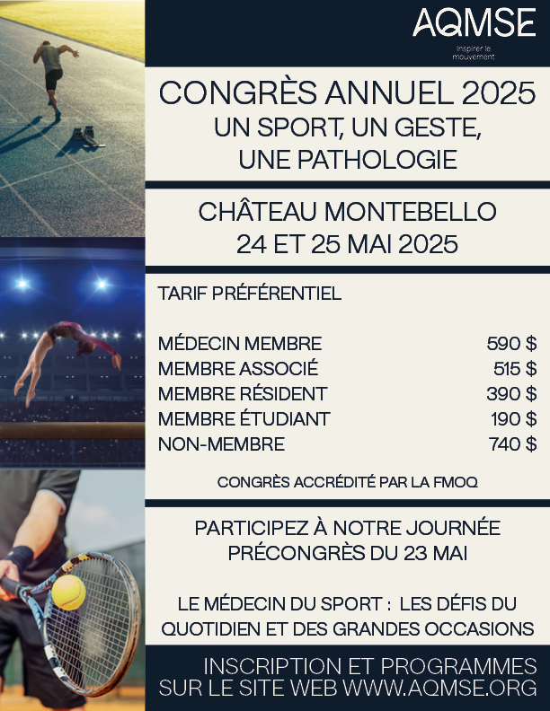 L’Association québécoise des médecins du sport et de l’exercice tiendra un précongrès le 23 mai 2025 sur « Les défis du quotidien et des grandes occasions », suivi de son congrès annuel les 24 et 25 mai au Fairmont Château Montebello. Les places sont limitées : inscrivez-vous rapidement pour ne pas manquer cet événement incontournable!
