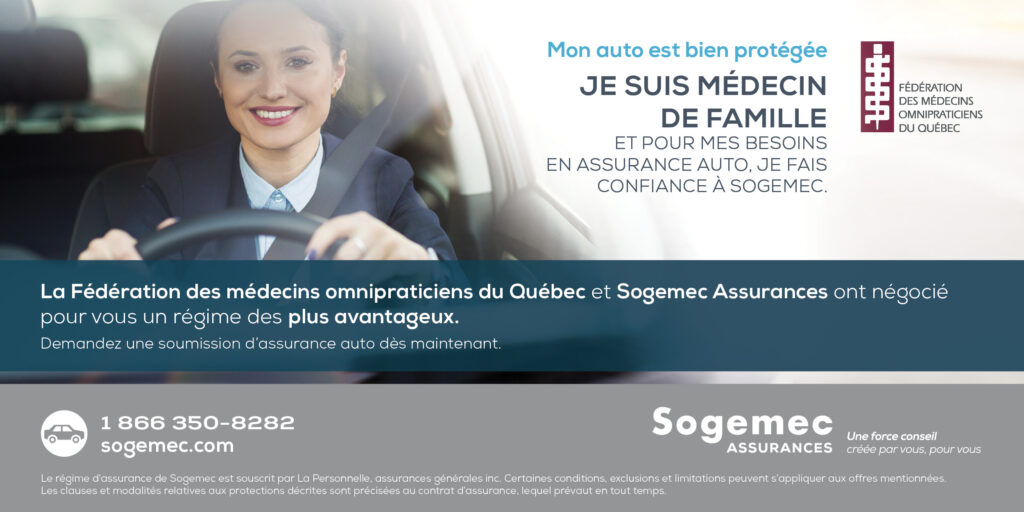 Grâce à une entente avec Sogemec Assurances, les membres de la FMOQ peuvent bénéficier d’un régime d’assurance auto sur mesure, à des conditions préférentielles. Demandez votre soumission dès maintenant!